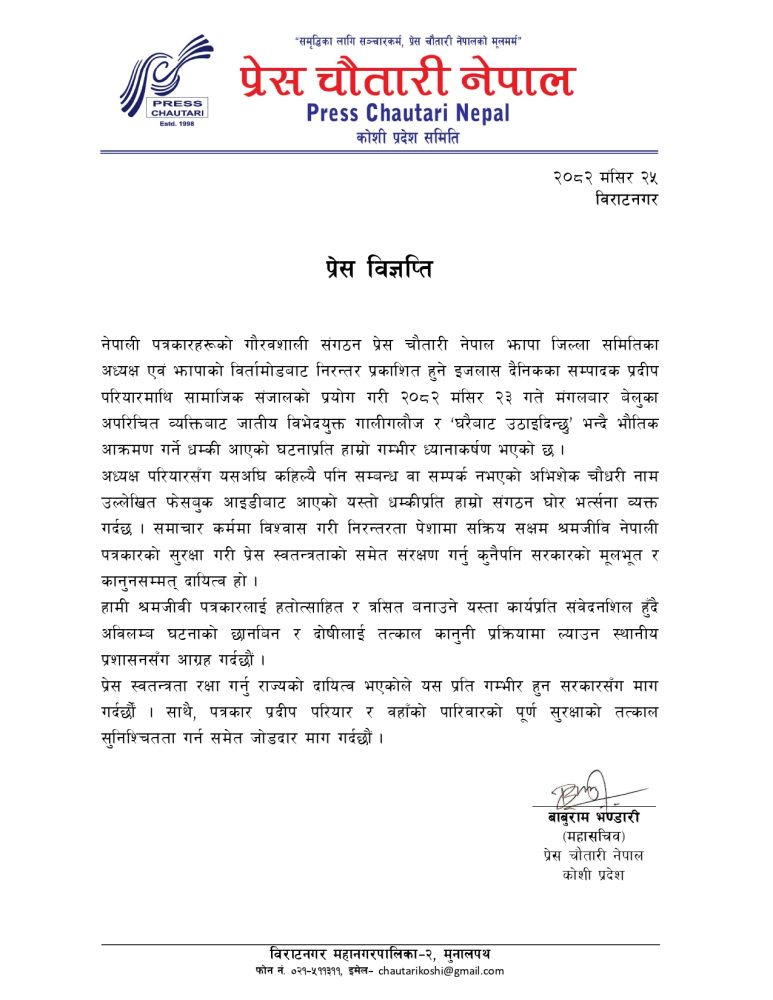 प्रेस चौतारी झापाका अध्यक्ष प्रदीप परियारमाथि भौतिक आक्रमण गर्ने धम्कीविरुद्ध जारी विज्ञप्ति